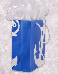 Say "Ahoy, matie" with these bold blue and white anchor gift bags. Great for any occasion this matte finish bag is finished with a rope like white handle. Pair it up with our Ocean Scalloped Tissue Paper (T-055) for that perfect finishing touch.