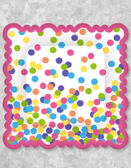 Brighten up your next get together with our fun scalloped edge Hooray Dots Dessert Plates. These 7" square dessert plates are each cut with a nice scalloped edge, they will be perfect for your special event or for any everyday dessert.