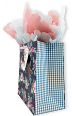 This is our beautiful gift bag called Alexandria's Wildflowers. Watercolor wildflowers are printed on premium white kraft, topped with iridescent glitter, a light pink grosgrain handle, and a die-cut tag adorned with silver foil. This gift bag is great for any occasion. You can complete it with any of our coordinating designer tissue paper, but we recommend our Cape Cod Scalloped Tissue Paper (T-446)
