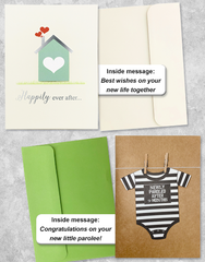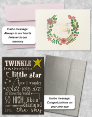 These 10 - 5” x 7” Cards are handmade, are printed on quality card stock and are embellished with foil, glitter, tip-ons, etc. Each card is individually wrapped for protection until you're ready to add your personal message and send. Each card comes with a coordinating envelope, some with printed designs or foil liners.