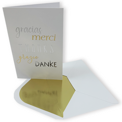 Our Around The World Thanks thank you note cards are printed on a premium white uncoated stock with gold and silver foil accents. Includes matching white envelopes with printed gold foil liner. These note cards are packaged in a set of 16. Great for your personal note writing or as a thoughtful gift.