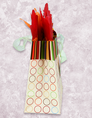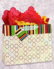 The colors of the Mediterranean come to mind with this warm modern bag. Perfect for your every gift giving occasion, and sure to warm a person's heart. This matte finish bag has a color coordinated organza ribbon and looks super with our Autumn Splendor Tissue Collection (T-068). Market size (13"x10"x5"), matte finish.