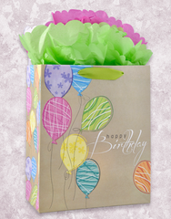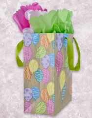 Colorful balloons float across this great birthday bag. This garden size (10"x12"x5") bag is printed on white kraft stock with fun glitter accents and is complete with a lime satin ribbon handle. Pair it with our Carnival Stripe Scalloped Tissue Paper (T-299) or Hot Hues Scalloped Tissue Paper (T-032) collections for a great coordinated look.