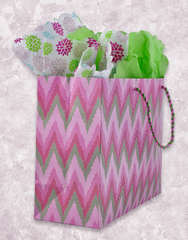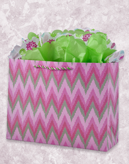 Give a gift with a little pizazz! The pink and green chevron pattern on our Bar Chevron gift bags are great for any occasion. This market size (13" x 10" x 5") bag has a matte finish, with a green and pink twist handle. Add our Ooo La La (T-250) or Nantucket Floral (T-237) scalloped tissue paper collections for a perfect finishing touch.