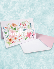 Our Best Florals note cards are printed on a white uncoated stock, with silver foil accents and a light pink envelope. These note cards are packaged in a set of 14. Great for you personal note writing or as a thoughtful gift.