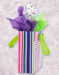 Bring colorful fun with the help of our Bikini Stripe Gift Bags. This studio size (8.5" x 10" x 4") is a matte finish bag featuring energized dots and stripes with a coordinating lime grosgrain ribbon handle.