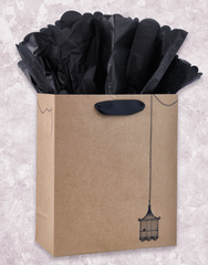This classic birdcage on kraft brings nostalgia for yesteryear. This studio size (8.5"x10"x4") is printed on brown kraft with black foil birdcage and a black grosgrain ribbon handle. Pair it with our Kraft & Black Scalloped Tissue Paper (T-313) for just the right finishing touch.