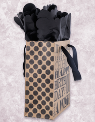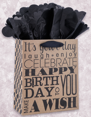 Say it right with this trendy bag of birthday expressions, great for anyone on your list. This studio size (8.5"x10"x4") is printed on brown kraft stock and has a black grosgrain ribbon handle. Pair it with our Black and White Scalloped Tissue Paper (T-051) or add a pop of color with our Live It Up Scalloped Tissue Paper (T-300) collections.