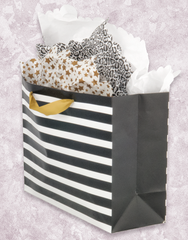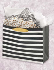 The simple back and white stripe pattern makes our Black Stripes gift bag perfect for any special occasion. This matte finished bag is completed with a gold grosgrain handle and black glitter. Top it off with our Black and White Scalloped Tissue Paper (T-051).
