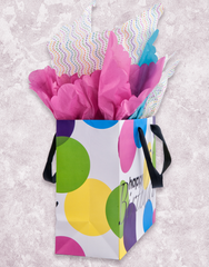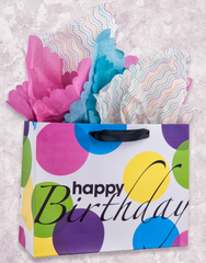 Our Bouncing Dots Gift Bags bring cheerful "Happy Birthday" greetings with large colorful dots and black foil accents. This market size (13" x 10" x 5"), matte finish bag has a black satin ribbon handle. It pairs beautifully with our Dot Jumble Scalloped Tissue Paper (T-275) collection.