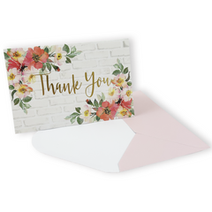 Our Bricks and Blossoms thank you note cards are printed on a premium white uncoated stock with gold foil accents. Includes light pink envelopes. These note cards are packaged in a set of 16. Great for your personal note writing or as a thoughtful gift.