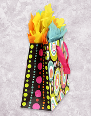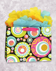 This Bright and Fun gift bag features trendy medallions, sure to spice up any gift giving occasion. This market size (13"x10"x5") is a matte finish bag with a classic satin ribbon style handle.