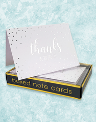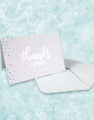 Our Bunches note cards are printed on a white uncoated stock, with silver foil accents and a white envelope. These note cards are packaged in a set of 14. Great for you personal note writing or as a thoughtful gift.
