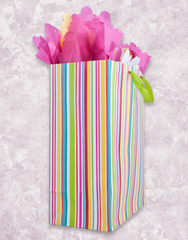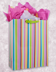 Make a big splash for a big gift with this jumbo size (16" x 20" x 8") bag. This fun matte finish bag is covered in bright colorful stripes and has a lime green grosgrain ribbon handle. It is a real show-stopper and ideal for a wide variety of personalities, ages, and gift-giving events! Finish off your package with Fusion Stripe Scalloped Tissue Paper (T-241) collection for a bit of contrast... or choose our Brights Scalloped Tissue Paper (T-010) collection for a classic finish!