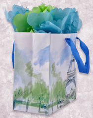 Beautiful watercolor painting of the Eiffel Tower evokes memories (or dreams) of a stroll along the Champs de Mars in Paris, hand in hand with the one you love. This medium square size (10"x10"x5") matte finish bag complete has sparkling glitter accents and a classic blue satin ribbon handle. Pair it with our Travel Toile (T-290) or Gelato (T-297) Scalloped Tissue Paper for a great finishing touch.