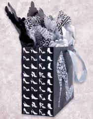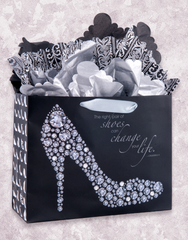 Our Change Your Life Gift Bags read "The right pair of shoes can change your life. ~ Cinderella." These matte finish bags feature nine clear jewels and a silver satin ribbon handle. Pair it with our Golden Leopard Scalloped Tissue Paper (T-322) or Pink Fluff Scalloped Tissue Paper (T-382) collections for added flair.