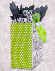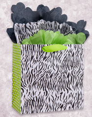 The chic zebra pattern and lime green polka dots make for one trendy gift bag. Our Chic Zebra Gift Bags are matte finish, medium square size (10" x 10" x 5") and finished off with a lime green grosgrain ribbon handle. Fun, bright and perfect for any gift-giving occasion! Pair it with our Trendy Zebra Scalloped Tissue Paper (T-086) collection or our Zebra Bling Scalloped Tissue Paper (T-249) collection for a dazzling gift-giving presentation!