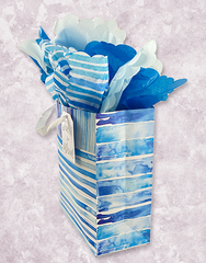Our Clearwater Gift Bag will make the perfect addition for your next special occasion. This garden sized gift bag (10" x 12" x 5") is printed on a white kraft finish with a silver foil accent. Complete with a white grosgrain handle and tag.