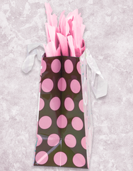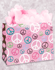 The dark brown tones and brightly colored peace signs make this bag the perfect choice for any recipient. This market size (13"x10"x5") is a gloss finish bag with a classic organza style handle.
