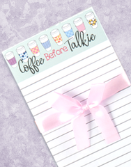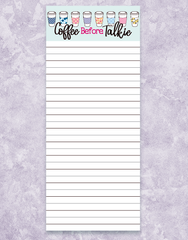 Never forget a thing with our fun Coffee Before Talkie Shopping List Pads. These 3.75" x 9" list pads come in a package of 60 sheets, with a magnet for your convenience. They are perfect for all your notes.