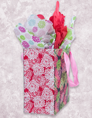 Our Colorful Carnations Gift Bags are fun, bright and perfect for any gift-giving occasion. This matte finish, medium square size (10" x 10" x 5") bag has a black background which is covered in trendy red, pink, light green and glitter green carnations with a pink satin handle. It pairs beautifully with our Nantucket Floral Scalloped Tissue Paper (T-237).