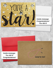 These 8 - 5” x 7” Cards are handmade, are printed on quality card stock and are embellished with foil, glitter, tip-ons, etc. Each card is individually wrapped for protection until you're ready to add your personal message and send. Each card comes with a coordinating envelope, some with printed designs or foil liners.