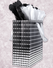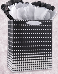 A dot ombre pattern in classic black and white is just right for any occasion. This matte finish bag has glitter accents and a white satin handle. Pair it with our matching Petal Pusher Scalloped Tissue Paper (T-296) for a great coordinated look.
