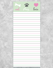 Stay organized with our fun Eat Play Love List Pads. These 3.75" x 9" list pads come in a package of 60 sheets, with a magnet for your convenience. They are perfect for all your notes.