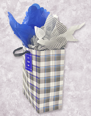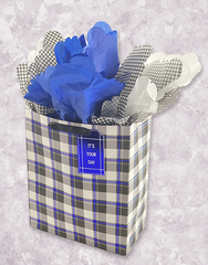 Our Edgewater Plaid Gift Bag will make the perfect addition for your next special occasion. This garden sized gift bag (10" x 12" x 5") is printed on a white kraft finish with a blue foil accent. Complete with a black grosgrain handle and tag.