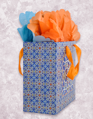 Add an exotic touch to your gift giving with our Ethereal Blues Gift Bags. This medium square size (10" x 10" x 5") bag has a Moroccan inspired tile pattern in rich blues, complete with dark blue glitter center and an orange satin handle. Add our Primary Scalloped Tissue Paper (T-066) collection to create the perfect finishing touch.