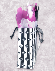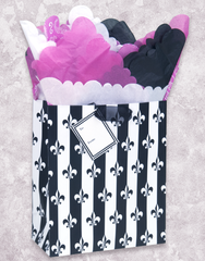 Add some Parisian drama to your presentation with our Fleur di Lis gift bags. This studio size (8.5"x10"x4") is a matte finish bag with a classic organza style handle.