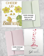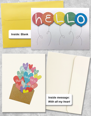 These 10 - 5” x 7” Cards are handmade, are printed on quality card stock and are embellished with foil, glitter, tip-ons, etc. Each card is individually wrapped for protection until you're ready to add your personal message and send. Each card comes with a coordinating envelope, some with printed designs or foil liners.