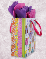 This fun gift bag with colorful owls will make your recipient kick up their heels. The studio sized bag has sparkling glitter accents and a pink satin handle and is great for any occasion. Pair it up with our Princess (T-060) or It's A Hoot (T-287) scalloped tissue paper collection for that perfect finishing touch.