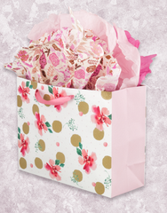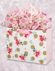 Our Gold Dots and Flowers will add the perfect touch of chic and fun to your gift. These colorful flowers are printed on a matte finish bag with gold glitter accents and a pink satin handle to match. Add our Enchanted Garden Scalloped Tissue Paper (T-280) for the completed look.