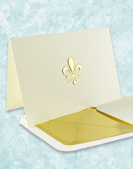 Our Golden Fleur de Lis Embossed note cards are printed on a cream textured stock, with gold foil accents and a cream with gold foil envelope. These note cards are packaged in a set of 12. Great for your personal note writing or as a thoughtful gift.