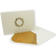 Our Golden Wreath embossed note cards are printed on a premium cream textured stock, with gold foil embossed accents and matching cream envelopes with printed gold foil liners. These note cards are packaged in a set of 12. Great for your personal note writing or as a thoughtful gift.