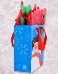 Everyone loves snowmen and this happy go lucky guy is no exception. Bright red glitter scarf and red satin ribbon handle add to the holiday cheer. Add a flurry of snowflakes with our Snowshine Scalloped Tissue Paper (T-266) for the perfect finishing touch.