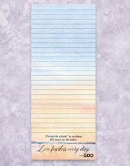 Be inspired to stay organized with our Live Fearless Shopping List Pads. These 3.75" x 9" list pads come in a package of 60 sheets, with a magnet for your convenience. They are perfect for all your notes.