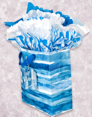 Our Making Waves gift bag is the perfect choice for your gift wrapping this year. This Studio sized bag (8.5" x 10" x 4") is printed on a white kraft finish and has blue glitter accents with a dark blue grosgrain handle to coordinate. Plus a hanging gift tag with silver foil. Wonderful for any gift giving occasions.