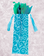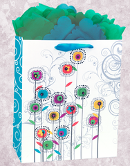 Show off your funky modern side with our Modern Flowers gift bag. This garden (10"x12"x5") is a matte finish bag with silver metallic ink and a teal satin ribbon handle.