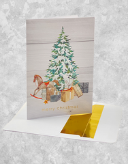 These 5" x 7" cards come in a set of 15, each card is treated with transparent glitter and gold hot stamp. They’re packaged in a lovely box with white envelopes and gold foil liner. This beautiful, sparkly card is perfect for your traditional, Christmas message!