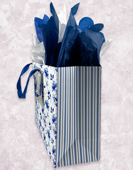 Our lovely Porcelain Roses Gift Bag has an elegant watercolor blue floral pattern. This Market sized gift bag (13" x 10" x 5") is printed on a white kraft stock with blue glitter accents. Hanging from the blue satin handle is a silver foiled gift tag that will make it the perfect addition for your next special occasion.