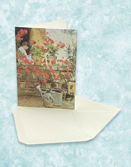 Our Old Masters note cards express your love of fine art along with your note. These 3.5" x 5" cards are printed on a uncoated textured stock, giving the look and feel of classic paintings. Our Red Geraniums set of 16 note cards are packaged in an elegant black patterned box with inside mounted acetate cover. Coordinating white envelopes have an inside red stripe pattern printed in lavender that complements the note card. Great for your personal note writing or as a thoughtful gift.