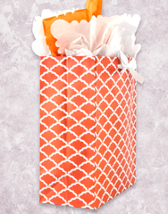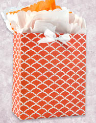 This gift bag with it's simple, straightforward pattern in a luscious orange and white with a white satin handle tied in a bow in front is just right for any occasion. Pair it with our matching Fruity Splash Scalloped Tissue Paper (T-314) for a great coordinated look.