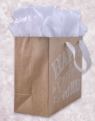 Right on trend, our Scratchy Wishes gift bags work great for any age. This market size (13" x 10" x 5") bag has a kraft finish with white grosgrain handle. Keep it simple, or add a burst of color with our Birthday Font List (T-349) or Big Watercolor Dots (T-330) scalloped tissue paper collections.