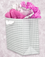 This classic houndstooth pattern in sophisticated silver metallic is a great gift bag for any occasion. This market size (13" x 10" x 5") bag has a matte finish, silver metallic ink and a white grosgrain handle. Add our Amethyst Elegance (T-248) or Crazy Damask (T-303) scalloped tissue paper collections for a perfect finishing touch.