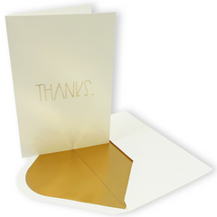 Our Simple Thanks thank you note cards are printed on a premium cream uncoated stock with gold foil accents. Includes matching cream envelopes with printed gold foil liner. These note cards are packaged in a set of 16. Great for your personal note writing or as a thoughtful gift.
