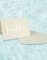 Our So Thankful note cards are printed on a cream uncoated stock, with gold foil accents and a cream envelope. These note cards are packaged in a set of 14. Great for you personal note writing or as a thoughtful gift.