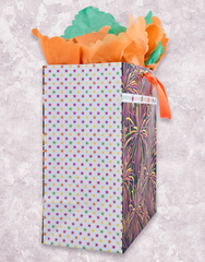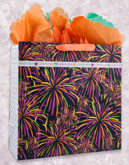 Help your friend or loved one celebrate their special occasion with flair... their own personal mini fireworks show. Our Sparkle Too Gift Bags are covered in energetic color bursts with an orange satin handle, and the word "Celebrate" ribboned across the top with 5 star-shaped rhinestone tip ons interspersed. Perfect for any age and any occasion that is cause for celebration! Add our Silver Stars Scalloped Tissue Paper (T-229) collection and/or our Fusion Stripe Scalloped Tissue Paper (T-241) collection for some extra fun.
