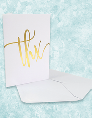 Our THX note cards are printed on a white uncoated stock, with gold foil accents and a white envelope. These note cards are packaged in a set of 14. Great for your personal note writing or as a thoughtful gift.